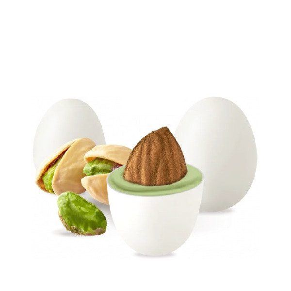 Confetti cioco-mandorla con mandorla tostata ricoperta da cioccolato bianco gusto pistacchio e da un sottile stato di zucchero.