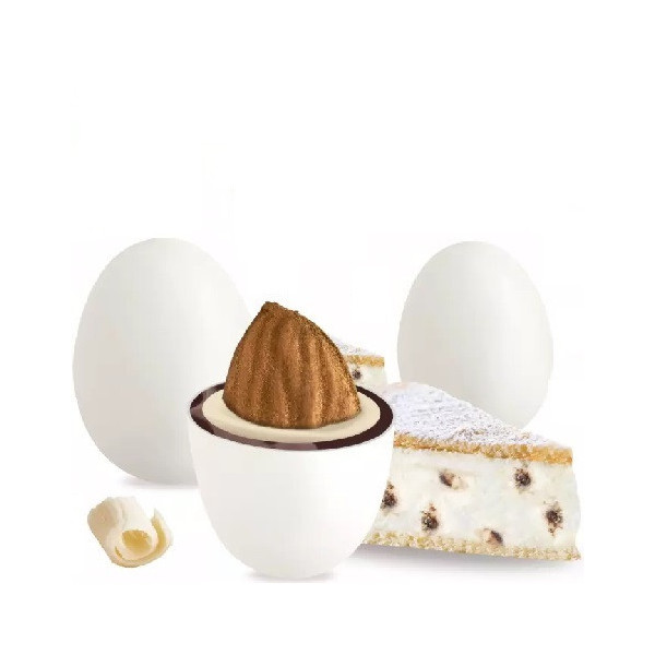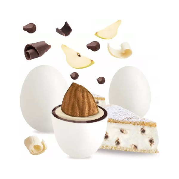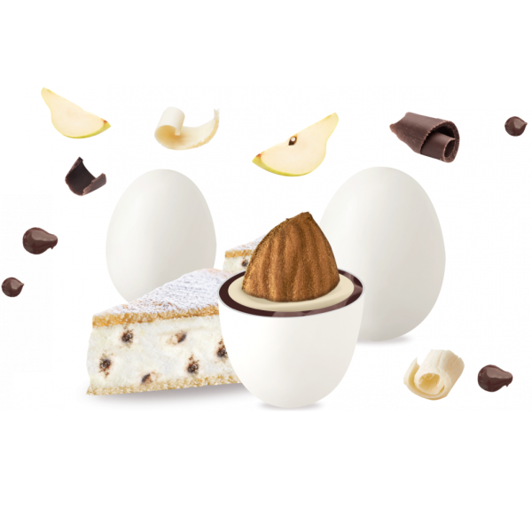 Mandorla tostata ricoperta di cioccolato bianco e fondente al gusto di crema torta ricotta e pera al cioccolato, ricoperti da un sottile strato di zucchero. Confetti bianchi le scatole Maxtris da 1 Kg.
