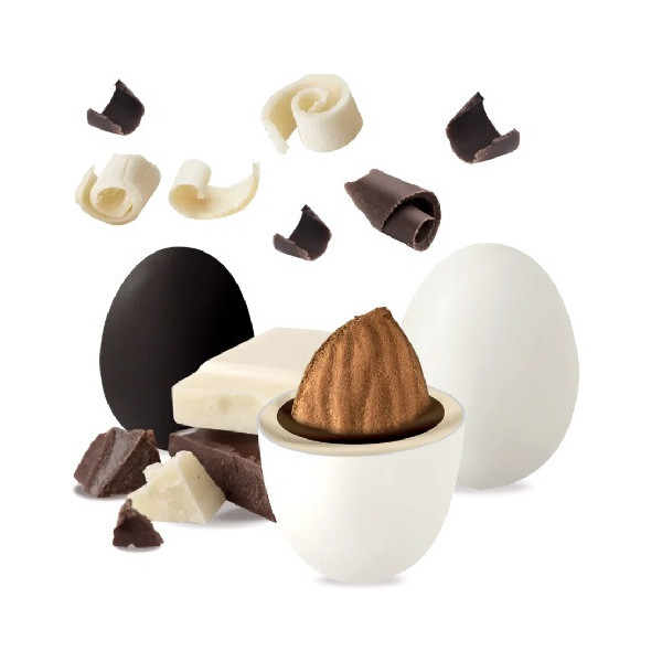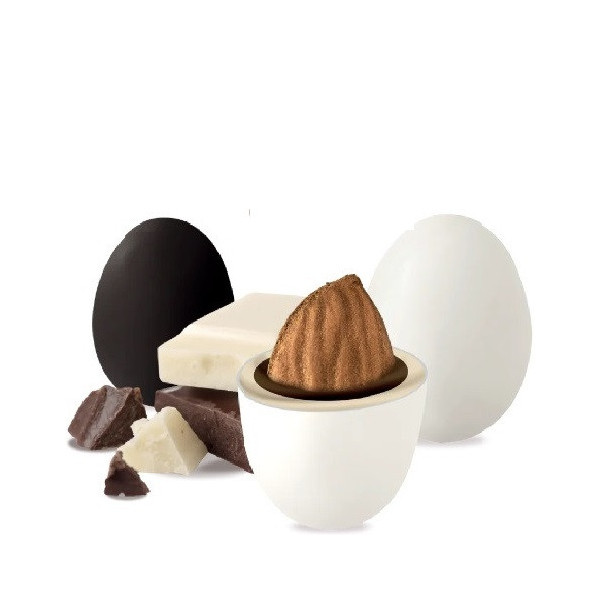 Confetto con mandorla tostata ricoperta di un doppio strato di cioccolato bianco e fondente, ricoperto da un sottile strato di zucchero bianco e nero.