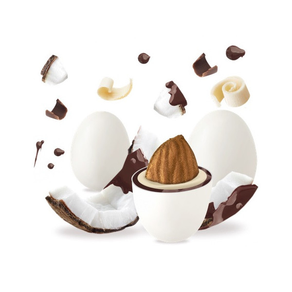 Maxtris Sbagliato Cocco confetti bianchi 1 Kg: mandorla tostata ricoperta di cioccolato al latte, cioccolato bianco e granella di cocco e da un sottile strato di zucchero, ideali per confettata.