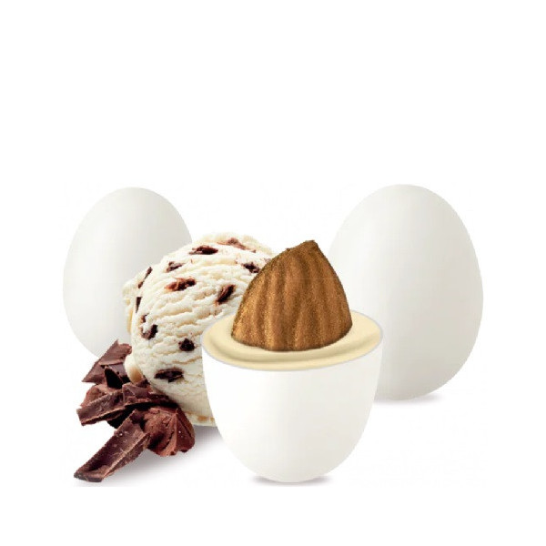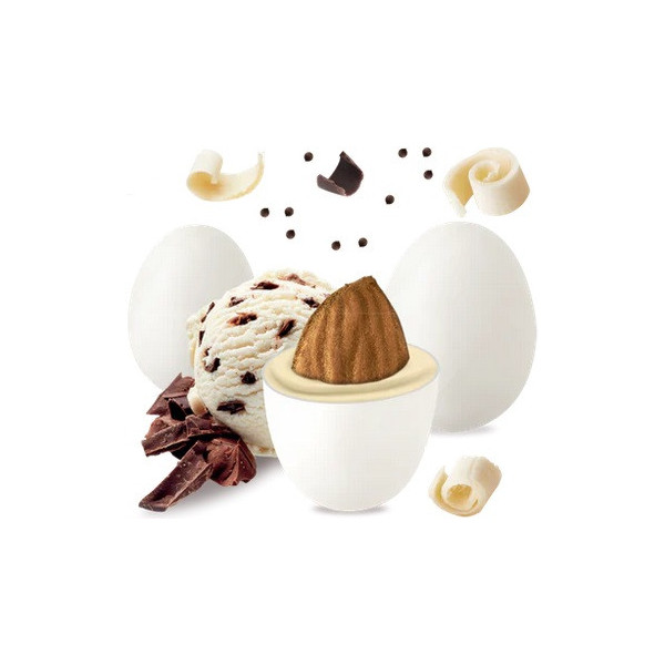 Confetti alla mandorla tostata avvolta in un duplice strato di cioccolato bianco al gusto di stracciatella, ricoperta da un sottile strato di zucchero.