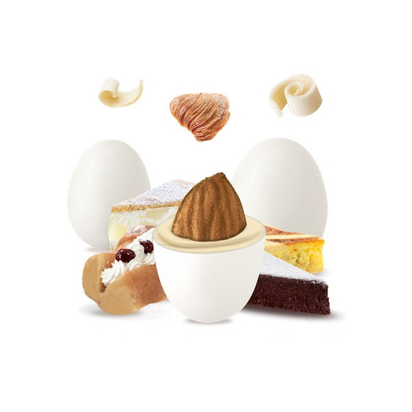 Confetti bianchi alla mandorla tostata avvolta di cioccolato bianco assortito nei gusti (baba’ con panna, pastiera napoletana, ricotta e pera, sfogliatella napoletana) e cioccolato fondente al gusto di torta caprese, ricoperta da un sottile strato di zucchero"