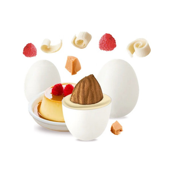 Mandorla tostata avvolta da uno strato di cioccolato bianco al gusto creme caramel, ricoperto di zucchero. Ideali per confettata cerimonia.