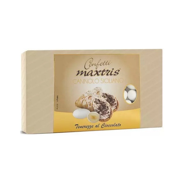 Maxtris Cannolo Siciliano confetti bianchi 1 Kg: mandorla tostata e cioccolato fondente e bianco al gusto cannolo siciliano. Confetti bianchi per confettata cerimonia.