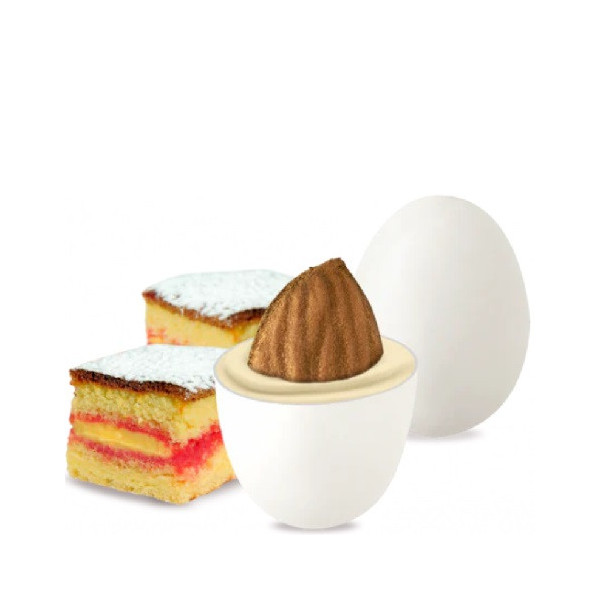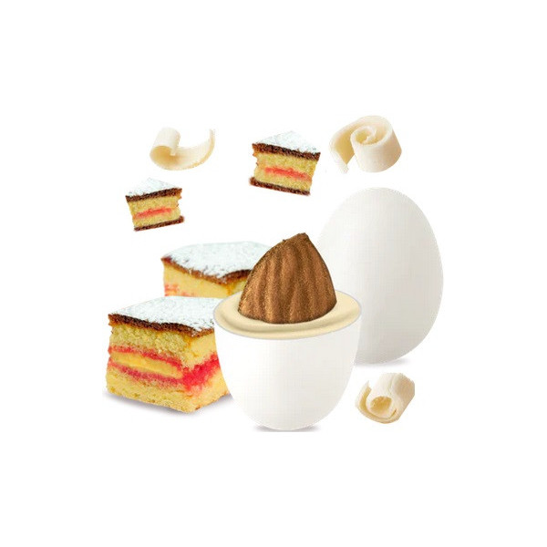Confetti con mandorla tostata avvolta in uno strato di cioccolato bianco al gusto di Zuppa Inglese, ricoperta da un sottile strato di zucchero.