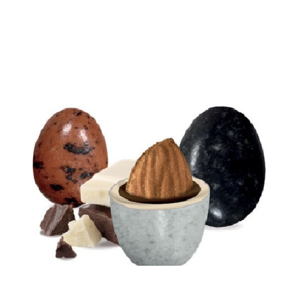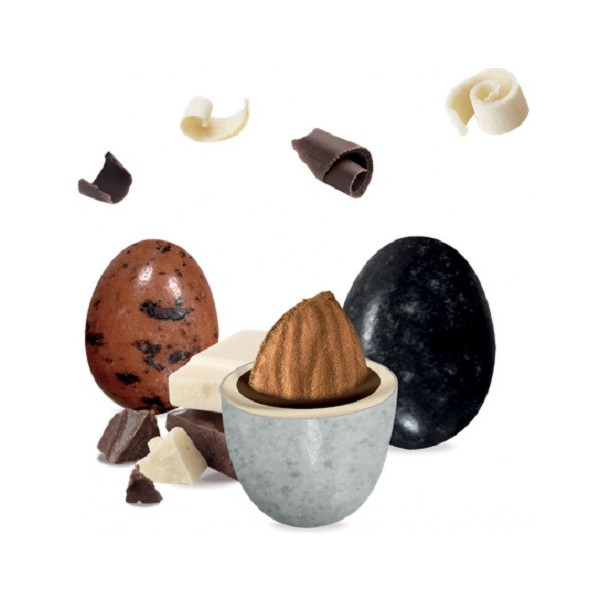 Ovette triplo strato al cioccolato al latte e bianco ed estratto di caffè.