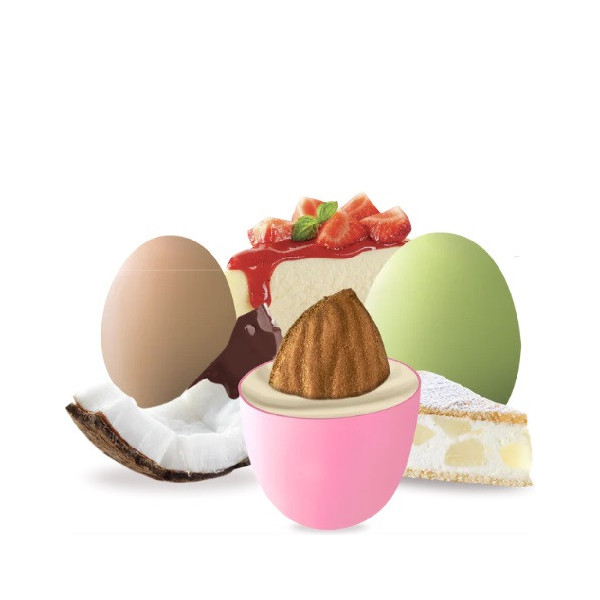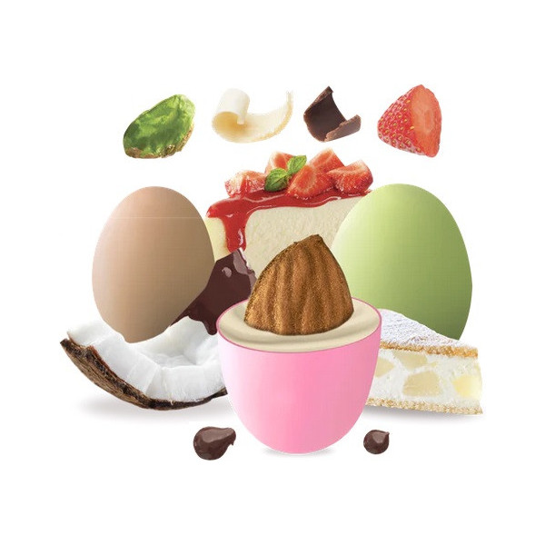 Ovette di cioccolato al latte con nocciola intera tostata e morbido ripieno al cioccolato al latte e pasta di nocciola.