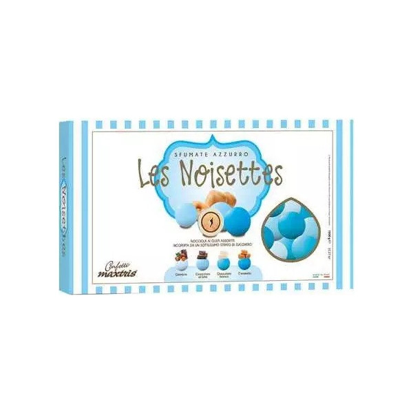 Les Noisettes Sfumate Celeste confetti Maxtris celesti sfumati 1Kg: confetti tondi celesti con nocciola tostata ricoperta di cioccolati assortiti ai gusti: gianduia, cioccolato al latte, cioccolato bianco e caramello