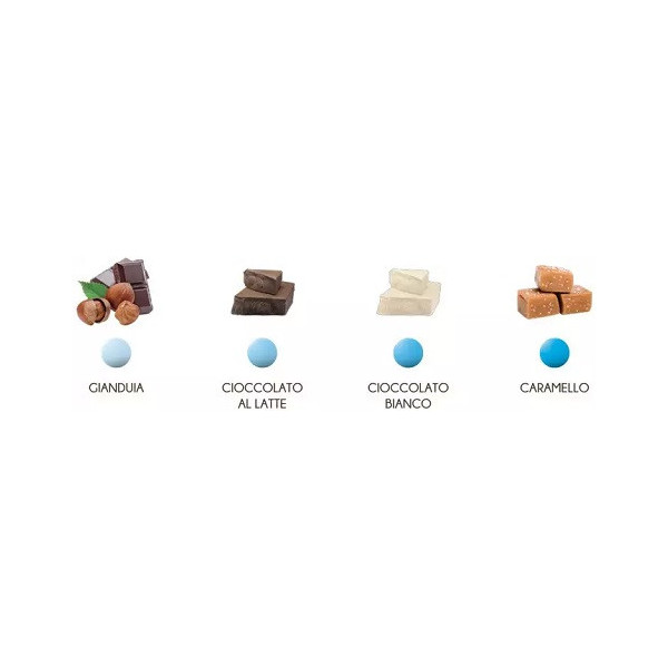 Confetti celesti sfumati con nocciola ricoperta di cioccolato bianco al latte, fondente, al latte e alle nocciole gianduia, ai gusti, gianduia, cioccolato al latte, cioccolato bianco e caramello, ricoperta da un sottilissimo strato di zucchero.