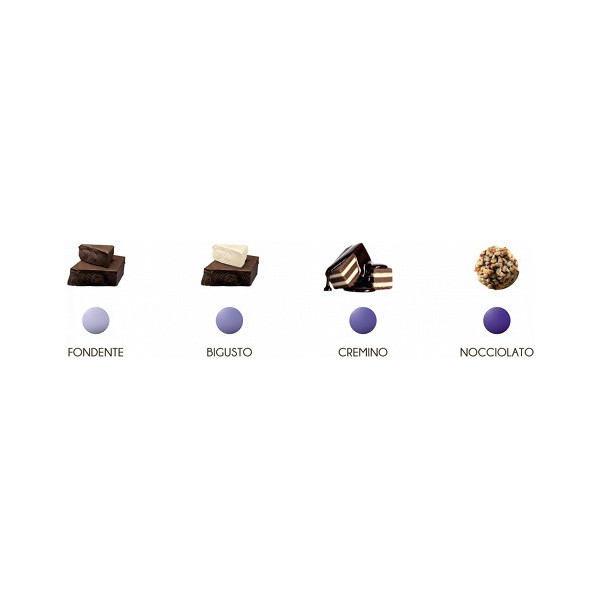 Guarda il colore e scegli il gusto dal lilla chiaro al lilla scuro: gianduia, cioccolato al latte, cioccolato bianco e caramello.
