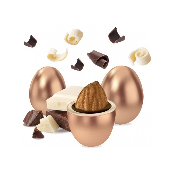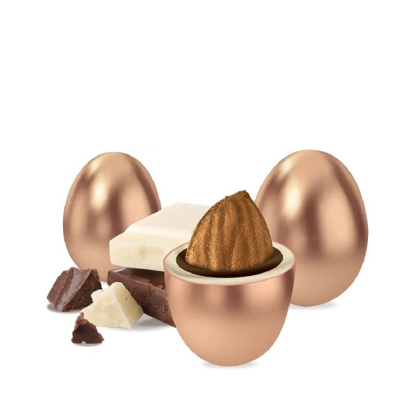 Confetti con Mandorla tostata ricoperta di cioccolato bianco e fondente in un sottile strato di zucchero color oro rosato o rose gold o rosa gold.