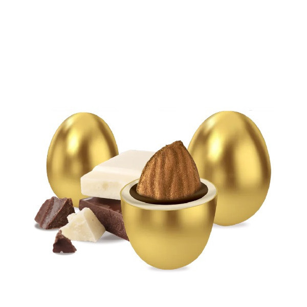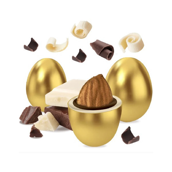 Maxtris Classico Oro confetti dorati 500 g: mandorla tostata ricoperta di cioccolato fondente e bianco. Confetti cioco-mandorla perfetti per sacchetti, la confettata e le tue bomboniere.