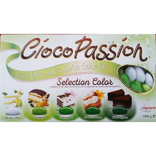 Ciocopassion selection color verde di Crispo da 1 Kg: confetti di cioccolato al latte ripieni di cioccolato bianco sfumati verde, ai gusti crema pasticceria, ideali per confettata.