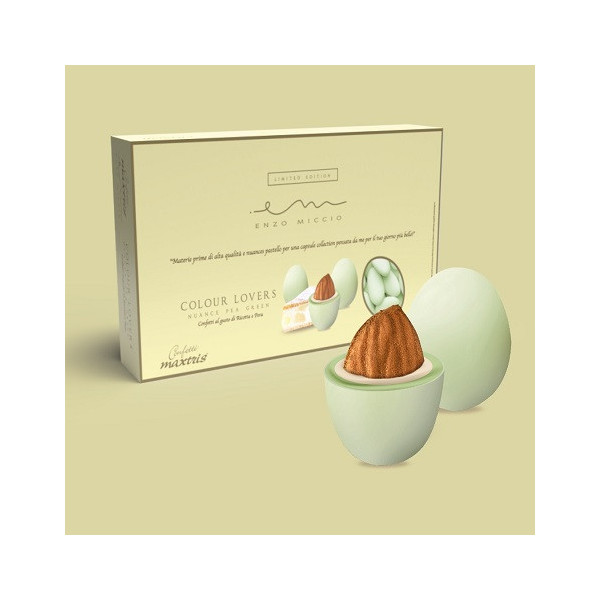 Confetti verdi con mandorla tostata e cioccolato bianco al gusto ricotta e pera, confettati nuance verde pisello da Maxtris