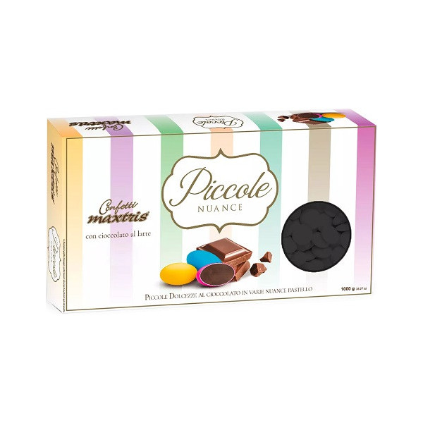 Maxtris Piccole Nuance Black Nero da 1 Kg: confetti neri con cioccolato al latte a forma di lente, piccole dolcezze al cioccolato nella nuance nero pastello da Maxtris.