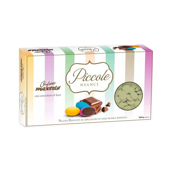 Maxtris Piccole Nuance Pea Green da 1 Kg: confetti verdi con cioccolato al latte a forma di lente, piccole dolcezze al cioccolato nella nuance verde pisello da Maxtris.