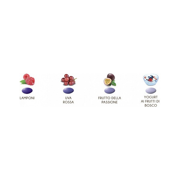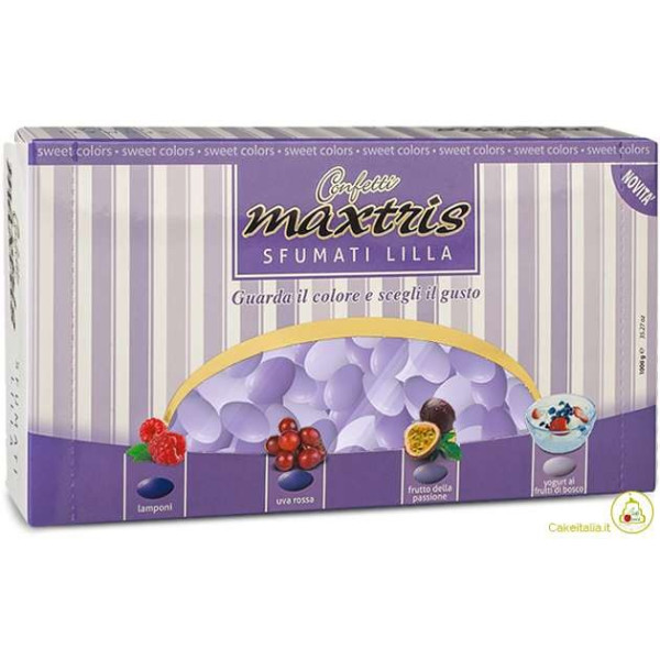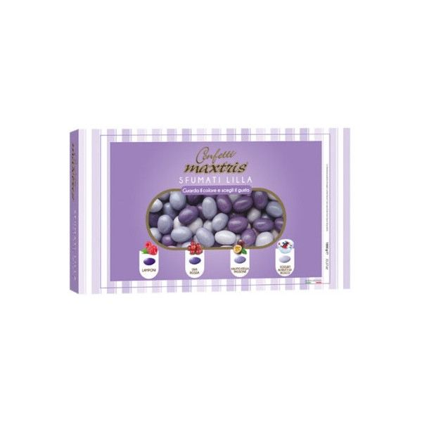 Confetti Maxtris Sfumati Lilla, 1 Kg, ciocomandorla senza glutine: mandorla tostata ricoperta di cioccolato bianco ai gusti: lamponi, uva rossa, frutto della passione e yogurt ai frutti di bosco.