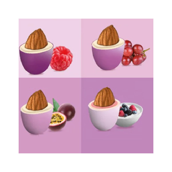 Mandorla tostata avvolta da uno strato di cioccolato bianco assortito nei gusti lamponi, uva rossa, frutto della passione e yogurt ai frutti di bosco, ricoperta da un sottilissimo strato di zucchero.