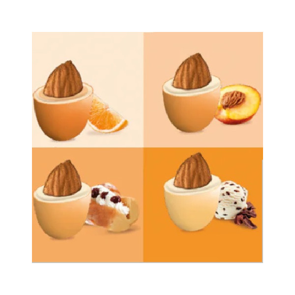 Mandorla tostata avvolta da uno strato di cioccolato bianco assortito nei gusti, ricoperta da un sottilissimo strato di zucchero.
