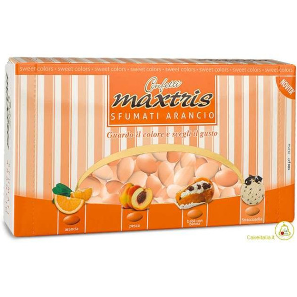 Confetti Maxtris Sfumati Arancio 1 Kg: mandorla tostata ricoperta da cioccolato bianco ai gusti assortiti (arancia, pesca, babà con panna e stracciatella) e da un sottile strato di zucchero.