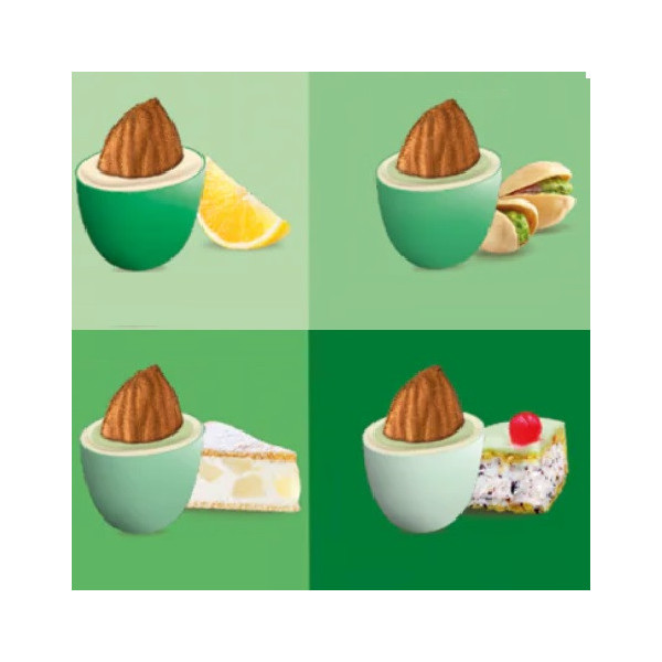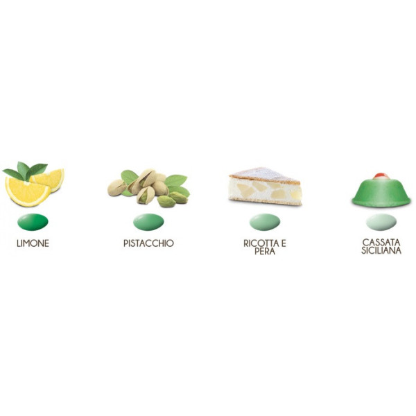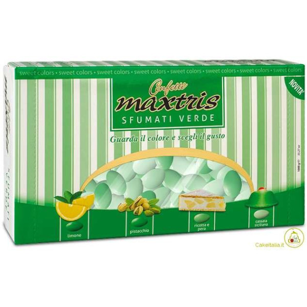 Confetti Maxtris Sfumati Verde: mandorla tostata ricoperta di cioccolato bianco ai gusti limone, pistacchio, ricotta e pera e cassata siciliana e confettata nei colori verde sfumati.