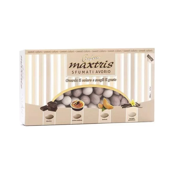 Confetti Maxtris Sfumati Avorio, 1 Kg, ciocomandorla senza glutine: mandorla tostata ricoperta di finissimo cioccolato ai gusti: classico, crema catalana, melone e vaniglia.