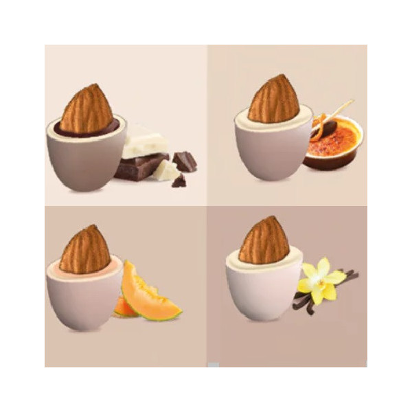 Mandorla tostata avvolta da uno strato di finissimo cioccolato assortito nei gusti, classico, crema catalana, melone e vaniglia, ricoperta da un sottilissimo strato di zucchero.