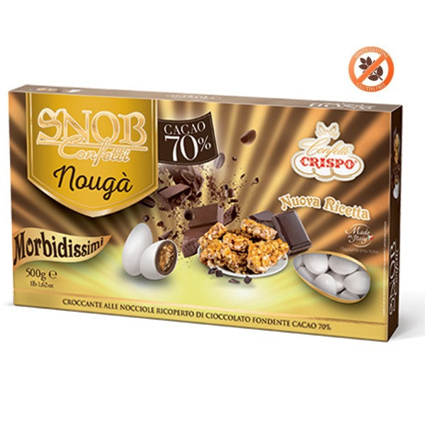 Confetti Snob Nougà da 500 g di Crispo: confetti bianchi con delicato e gustoso croccante alle nocciole, ricoperto di cioccolato fondente cacao 70%.