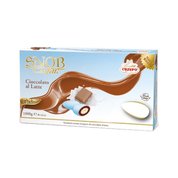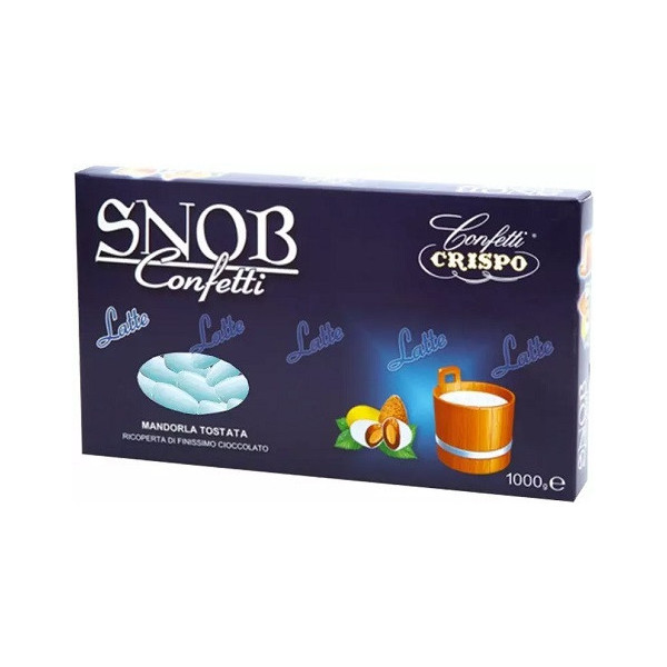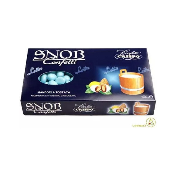 Snob celeste al latte Crispo 1 Kg: confetti celesti alla mandorla intera tostata ricoperta di un finissimo cioccolato al atte e confettato, in confezione da 1 Kg.