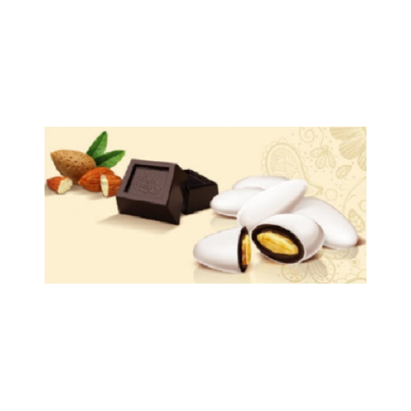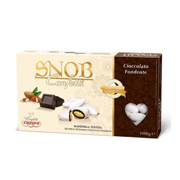 Confetti Snob bianchi al Cioccolato Fondente sono confetti con mandorla intera tostata ricoperta di purissimo cioccolato fondente, il tutto ricoperto da un sottilissimo strato di zucchero, in confezione Snob da 1000 gr.