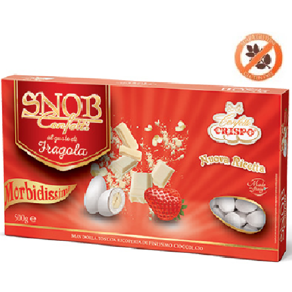 Snob alla fragola Crispo: confetti bianchi con mandorla tostata ricoperta di cioccolato al gusto di fragola in confezione da 500 g.