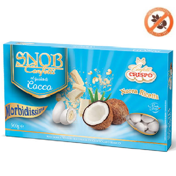 Confetti snob al gusto cocco Crispo: confetti bianchi alla mandorla tostata ricoperta di cioccolato bianco aromatizzato al gusto di cocco in confezione da 500 g Crispo.