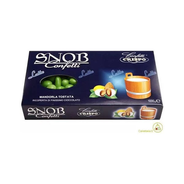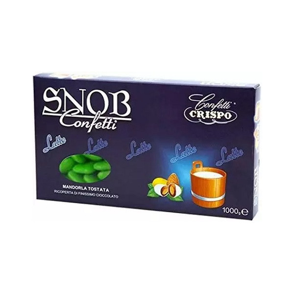 Snob verde al latte Crispo 1 Kg: confetti verdi alla mandorla intera tostata ricoperta di un finissimo cioccolato al atte e confettato, ideali per fidanzamento o promessa di matrimonio.