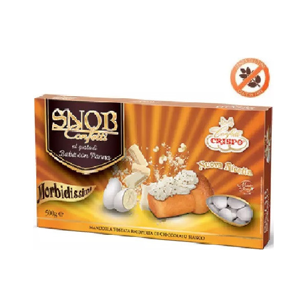 Snob cioccolato bianco Crispo 1 Kg: confetti bianchi con mandorla intera tostata ricoperta di purissimo cioccolato bianco, ideali sacchetti bomboniera e confettata.