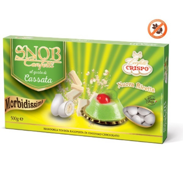 I confetti Snob Cassata alla mandorla intera tostata ricoperta di purissimo cioccolato Crispo, allieteranno la tua cerimonia con il gusto della crema Cassata, adatti al festeggiamento del tuo matrimonio, comunione, compleanno o un battesimo.