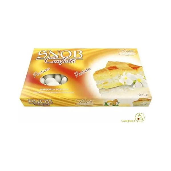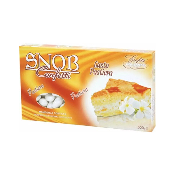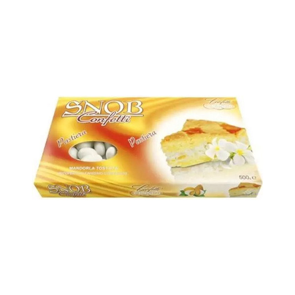 Confetti Snob Pastiera sono confetti bianchi con mandorla intera tostata ricoperta di purissimo cioccolato alla crema pastiera, il tutto ricoperto da un sottilissimo strato di zucchero, in confezione da 500 g.