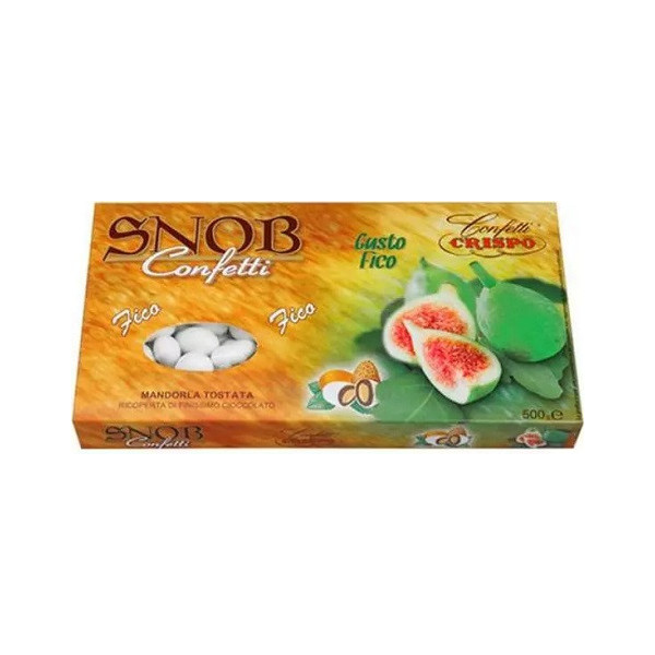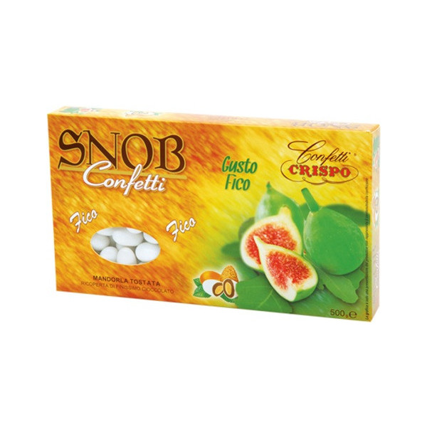 Confetti Snob bianchi al gusto fico, sono confetti con mandorla intera tostata ricoperta di purissimo cioccolato al fico, il tutto ricoperto da un sottilissimo strato di zucchero, in confezione da 500 g.