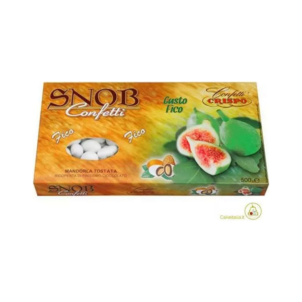 Confetti Snob fico Crispo: mandorla tostata ricoperta di cioccolato al gusto di fico. Confetti ciococmandorla bianchi al gusto frutta, ideali per confettata Crispo per il tuo evento o ricorrenza.