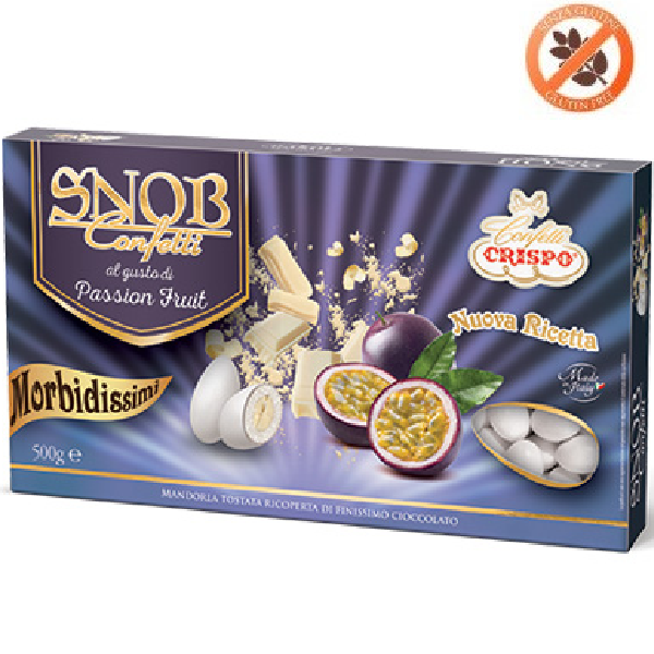 Confetti snob Passion Fruit sono confetti bianchi con mandorla intera tostata ricoperta di purissimo cioccolato al frutto della passione il Passion Fruit, il tutto ricoperto da un sottilissimo strato di zucchero, in confezione da 500 g.