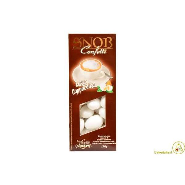 Confetti Bianchi Snob Cappuccino sono confetti con mandorla intera tostata ricoperta di purissimo cioccolato alla crema Cappuccino, il tutto ricoperto da un sottilissimo strato di zucchero, in confezione da 150 gr.