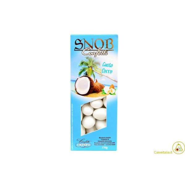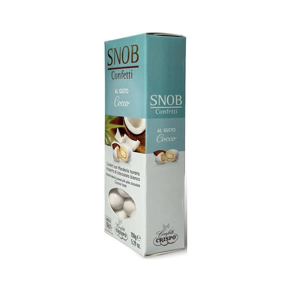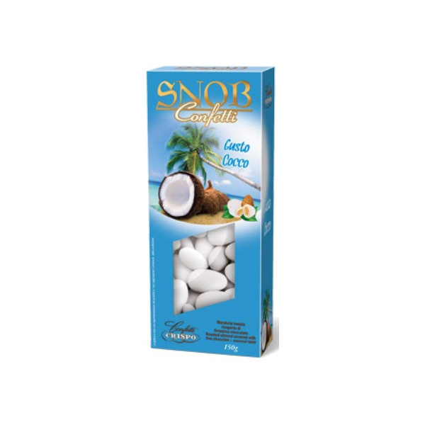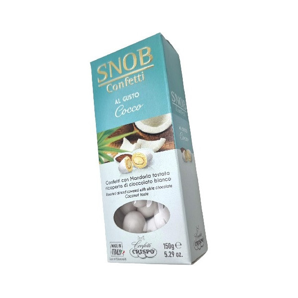 Confetti Bianchi Snob Cocco sono confetti con mandorla intera tostata ricoperta di purissimo cioccolato alla crema di Cocco, il tutto ricoperto da un sottilissimo strato di zucchero, in confezione da 150 gr.
