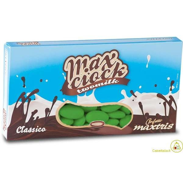 I Confetti Max Ciock Classico Verdi TwoMilk hanno un anima di Cioccolato Bianco avvolto in uno strato di cioccolato al Latte e ricoperti da un sottilissimo strato di zucchero.