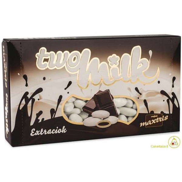 Two Milk Extra Ciok confetti bianchi Maxtris 1 Kg: un anima di cioccolato fondente avvolto da cioccolato bianco e confettato. Confetti per confettata cerimonia.