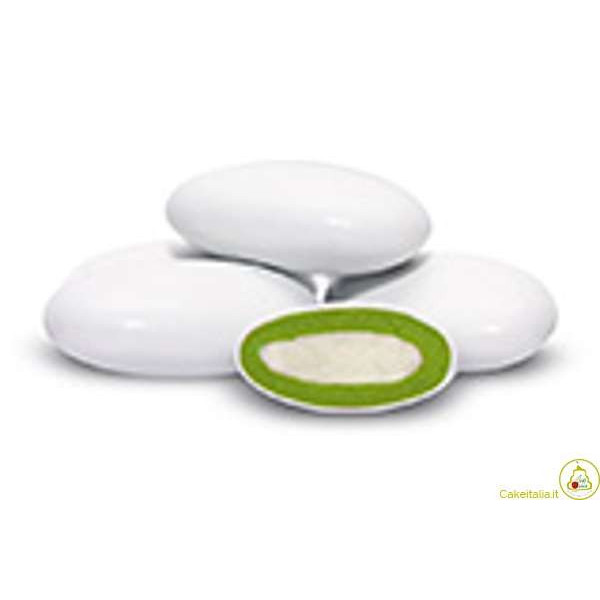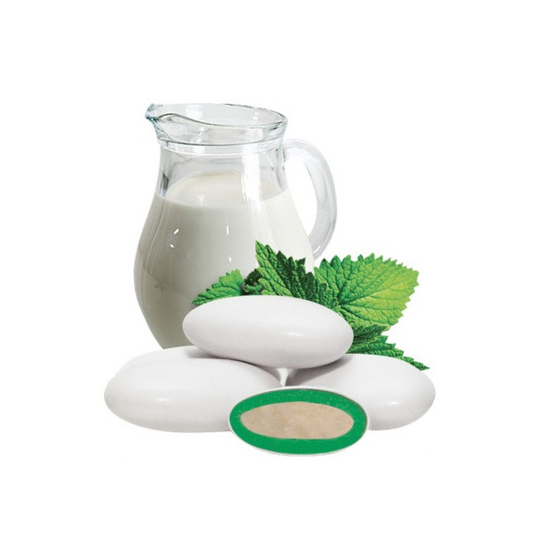 Confetti con un anima di cioccolato bianco avvolto in cioccolato bianco al gusto Latte e Menta e ricoperti da un sottilissimo strato di zucchero.