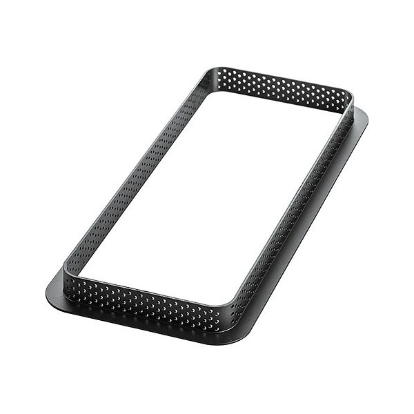 Stampo ad anello rettangolare lungo 19 o 29 cm ed alto 2 o 3,5 cm in acciaio micro-forato. Fascia rettangolare ideale per basi di torte crostate o come cutter o tagliapasta.