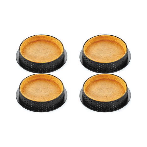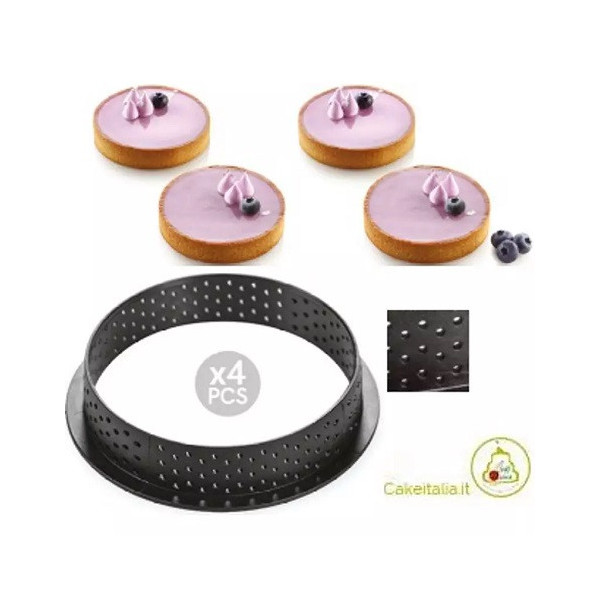 Set 4 Tarte Ring Round ø10xh2 cm Silikomart: anelli microforati tondi, usati come stampi forno, sono ideali per realizzare basi di pasta frolla per crostatine o tortine tonde. o come tagliapasta o cutter.