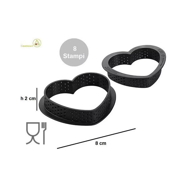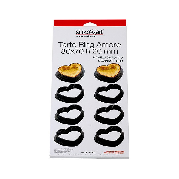 Con gli 8 Stampi ad anello cuore per tortine o Crostatine o Tarte Ring Amore di 80 mm da Silikomart puoi realizzare 8 crostatine a cuore da 7 cm. Gli 8 Anelli cuore di 8 cm x 7 cm x h 2 cm in materiale termoplastico composito, micro-forato, antiaderente, indeformabile adatto all'uso in forno fino a 180°C per la realizzazione delle basi, puoi usarli anche come tagliapasta o cutter a forma di cuore da 8 cm