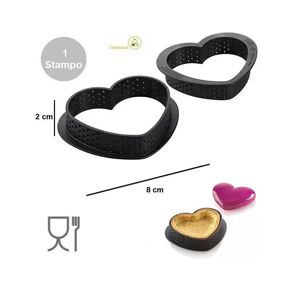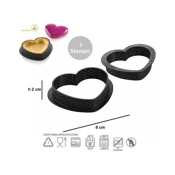 Con lo stampo ad anello cuore per tortine o crostatine o Tarte Ring Amore di 80 mm da Silikomart puoi realizzare 8 crostatine a cuore da 7 cm. L'anello cuore di 8 cm x 7 cm x h 2 cm in materiale termoplastico composito, micro-forato, antiaderente, indeformabile adatto all'uso in forno fino a 180°C per la realizzazione delle basi, puoi usarli anche come tagliapasta o cutter a forma di cuore da 8 cm