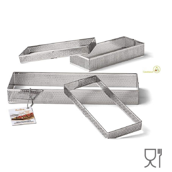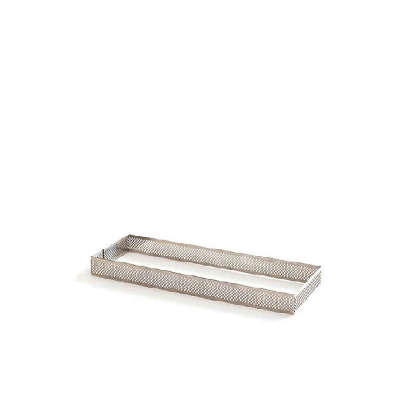 Stampo ad anello rettangolare lungo 19 o 29 cm ed alto 2 o 3,5 cm in acciaio micro-forato. Fascia rettangolare ideale per basi di torte crostate o come cutter o tagliapasta.