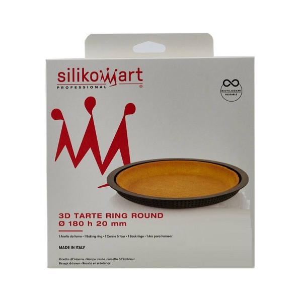 Con lo stampo ad anello tondo, 3D Tarte Ring Round da Silikomart, realizzi gusci di pastafrolla o cestini di pastafrolla, basi per torte o crostate. per crostate tonde tridimensionali da 17 cm. L'anello tondo 3D di diametro 18 cm in materiale termoplastico composito, micro-forato, antiaderente, indeformabile adatto all'uso in forno fino a 180°C per la realizzazione delle basi ad effetto 3D.
